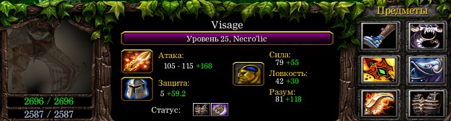 Выбраный враг получает -32% скорости передвижения и атаки, Visage же получает +32% к скорости бега и атаки. Дальность использования - 600.